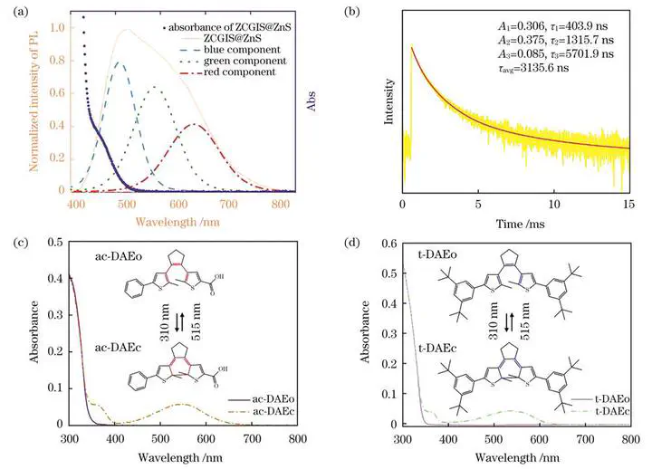 使用二芳基乙烯(DAE)光分子开关调控白色发光量子点(WQDs)的荧光特性,通过DAE分子开关的异构,有效控制其与WQDs之间的三线态能量传递(TET),实现了宽光谱WQDs荧光的可逆开关功能。原位荧光强度测试结果显示,当使用叔丁基官能团修饰的DAE(t-DAE)进行WQDs荧光调控时,以Förster共振能量转移机制为主的过程仅能使WQDs荧光猝灭34.1%,荧光开关比为1.5。当使用羧基官能团修饰的DAE(ac-DAE)时,羧基以共价键形式连接到WQDs表面,可实现短距离的Dexter能量传递,荧光猝灭效率与开关比分别高达99.2%与125。纳秒瞬态吸收光谱测试中出现的三重态吸收特征峰,有效验证了基于Dexter能量传递的TET机制。在8个开关循环测试下,体系呈现优异的可逆性和抗疲劳性。本研究表明,利用DAE分子开关可实现对WQDs荧光开关的高效可逆光调控。
