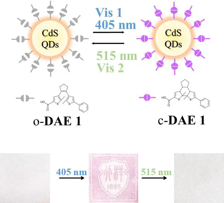 All-visible light-activated diarylethene (DAE) photoswitches are highly attractive for applications in smart photoresponsive materials. The photocyclization of DAE via the low-lying excited triplet state through triplet energy transfer (TET) from a sensitizer has been proven to be an effective approach for the realization of this scheme. However, the TET process is sensitive to oxygen and typically requires more than one sensitizer per photoswitch to facilitate sensitized photocyclization. Herein, we present a bi-component system comprising carboxylic acid-functionalized DAEs and CdS quantum dots (QDs) to achieve all-visible light-activated photoswitching. Due to the large surface area-to-volume ratio of CdS QDs and surface anchored DAEs, one CdS QD can activate at least 18 DAE molecules in the solution without oxygen exclusion. The efficiency of photocyclization of DAEs under visible light irradiation through energy transfer from CdS QDs is nearly comparable to that of direct UV light irradiation. Moreover, our strategy is adaptable for solid-state applications in the presence of air, enabling reversible writing and erasing of color and patterns by adjusting irradiation wavelengths in the visible region.